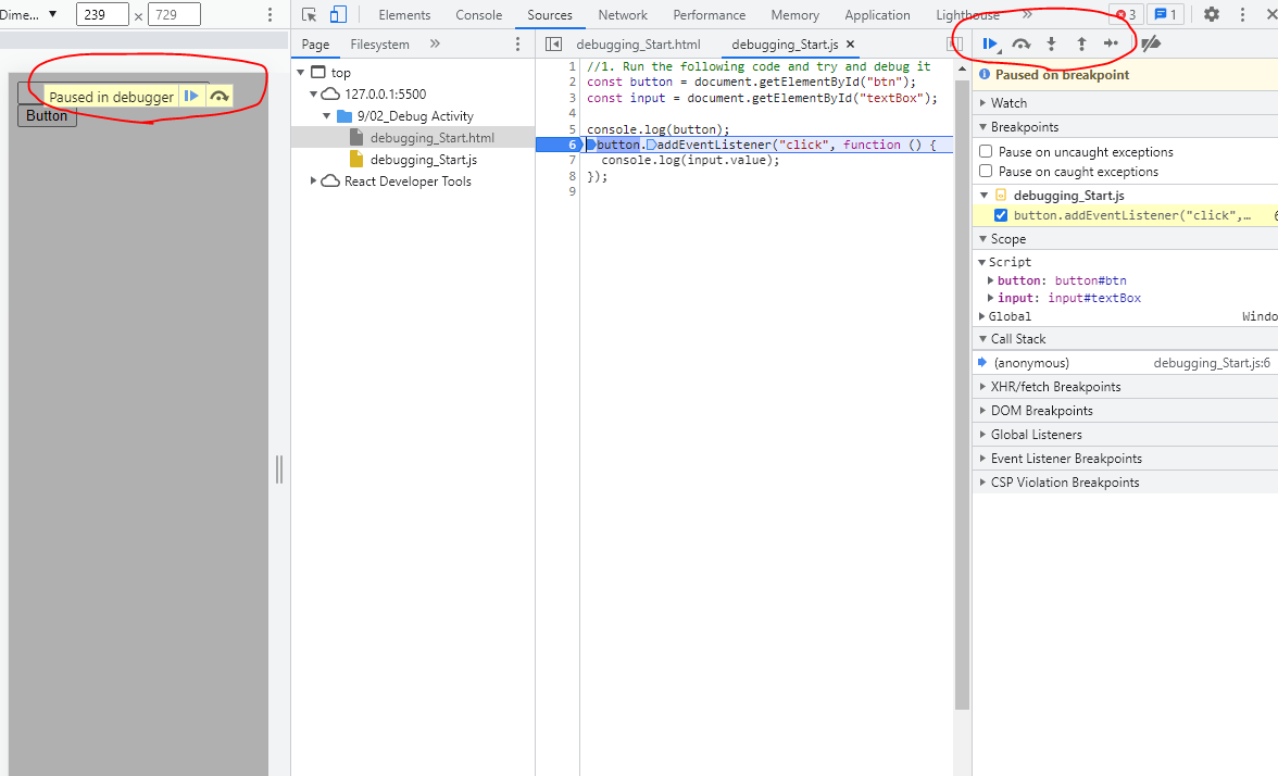 2) 디버깅을 하려는 6번째 줄을 클릭해서 break point 를 걸어준다.