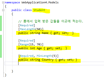 Student이라는 모델은 Name, Age, Country를 Required로 선언했다. 그리고 그것의 길이를 최대 50, 그리고 나이에 대한 범위를 따로 지정해줄수 있고, Country의 단위또한 최소단위로 지정해주었다.